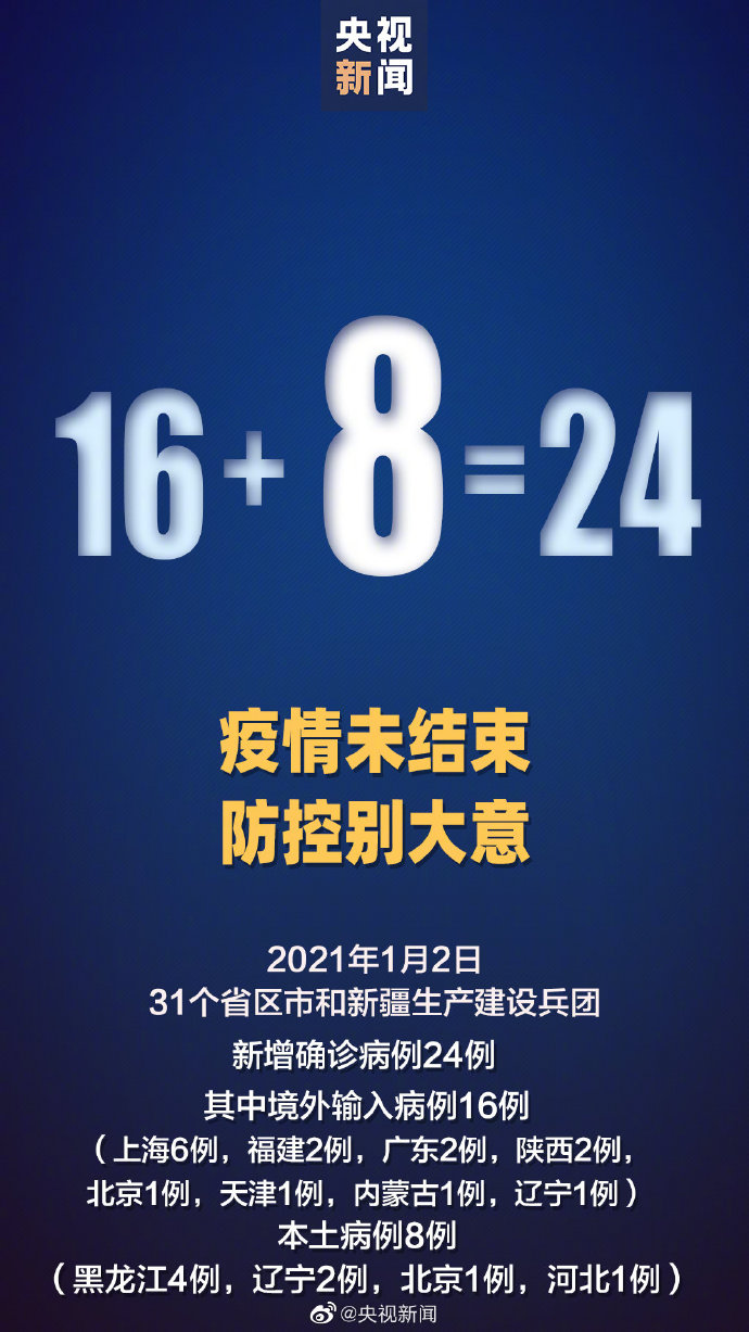 疫情最新数据消息:1月2日0—24时,31个省(自治区、直辖市)和新疆生产建设兵团报告新增确诊病例24例,其中境外输入病例16例(上海6例,福建2例,广东2例,陕西2例,北京1例,天津1例,内蒙古1例,辽宁1例),本土病例8例(黑龙江4例,辽宁2例,北京1例,河北1例);无新增死亡病例;无新增疑似病例。