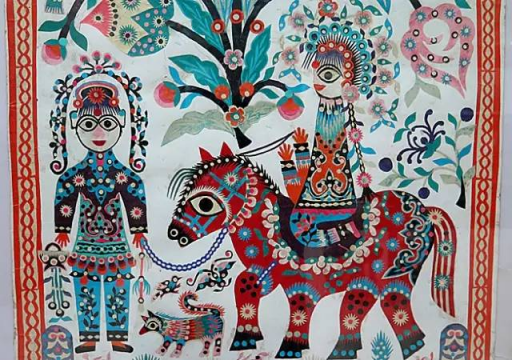 她剪《江娃拉马梅香骑》,描绘了一对年轻夫妻在旅行路上甜蜜恩爱的场景。