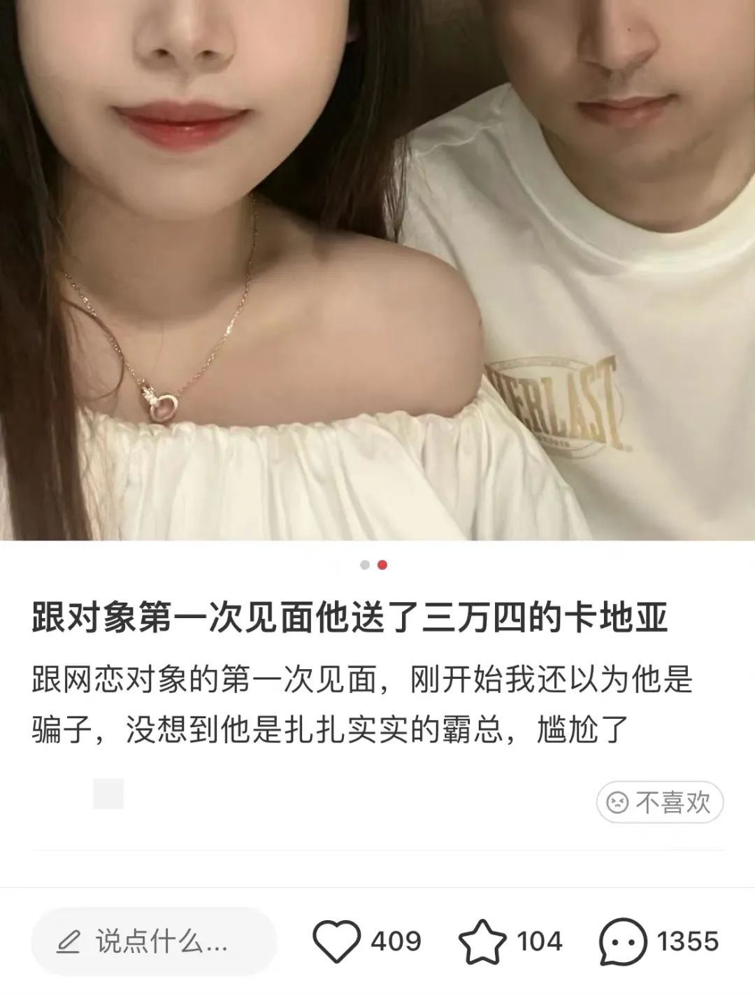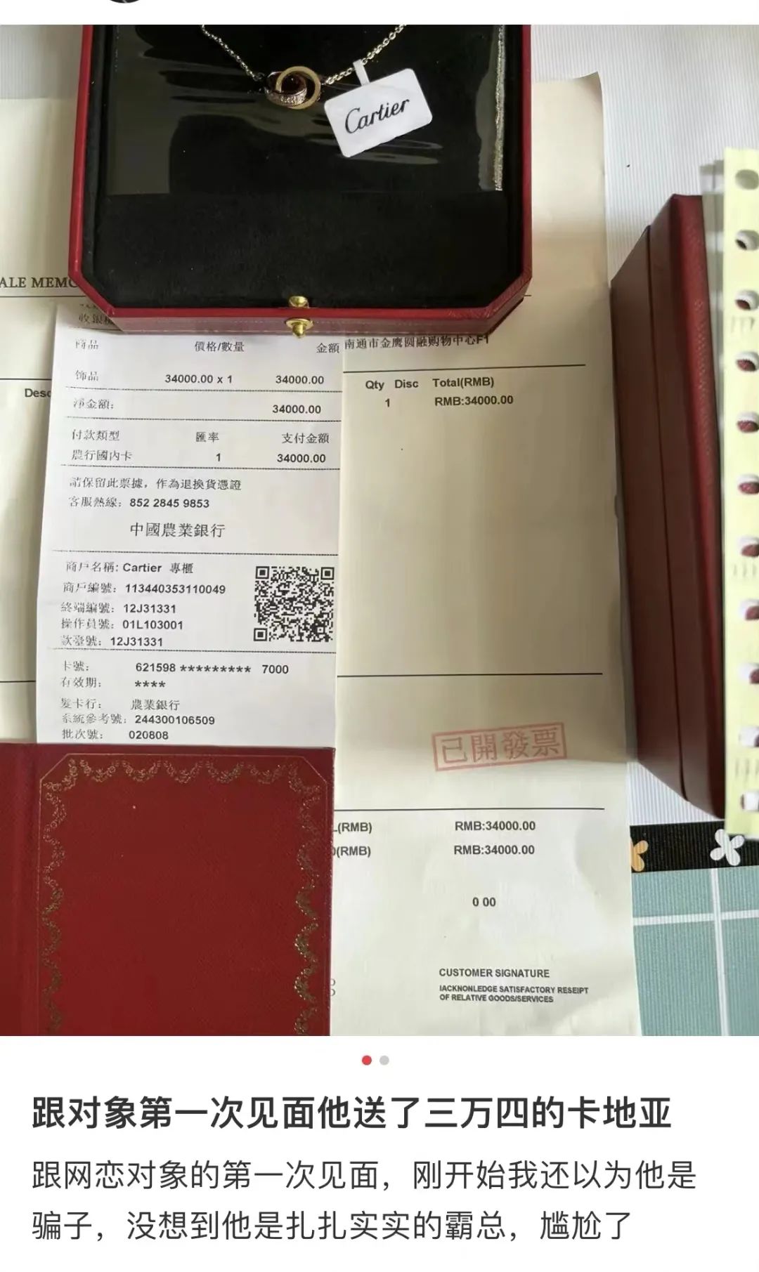 还看到一则热帖,一个女生发文秀了对象第一次见面时候送的三万四的卡地亚,