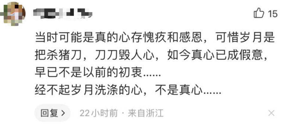 “当时可能真的心存愧疚和感恩,可惜岁月是把杀猪刀,刀刀毁人心,如今真心已成假意,早已不是以前的初衷。 经不起岁月洗涤的心,不是真心,而是人性。”
