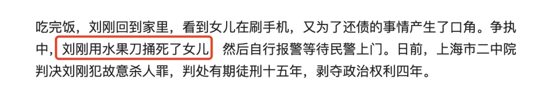 这个消息,成了压垮刘刚的最后一根稻草。 几天后的晚上,刘刚回到家中,因债务问题,和女儿发生了激烈的争吵。 那一刻,这些年的委屈和压力全部涌上心头。 刘刚彻底失控,用水果刀将女儿捅死,随后报警自首。
