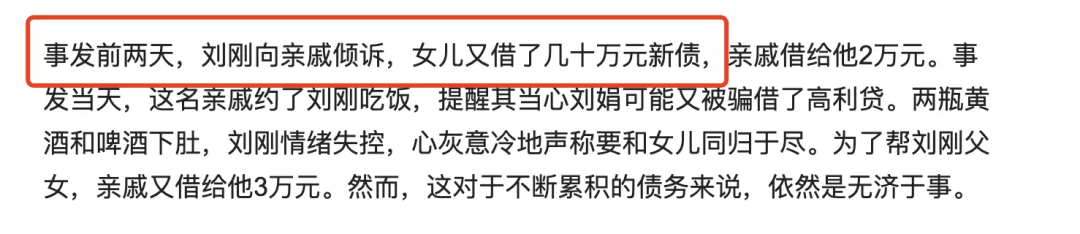 3年来,刘娟已欠款百余万元。 她每天被催债电话轮番轰炸。 甚至还有人,将电话打到了父亲刘刚那里。 再能隐忍的父亲,面对这样的压力也会崩溃。 就在事发前几天,刘娟再次向父亲袒露,自己又欠下了几十万网贷。
