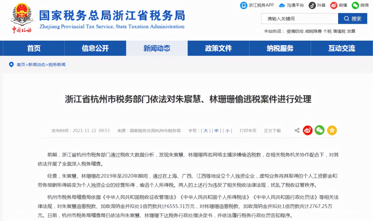 前期,浙江省杭州市税务部门通过税收大数据分析,发现朱宸慧(微博ID:雪梨Cherie)、林珊珊(微博ID:林珊珊_Sunny)两名网络主播涉嫌偷逃税款,在相关税务机关协作配合下,对其依法开展了全面深入税务稽查。