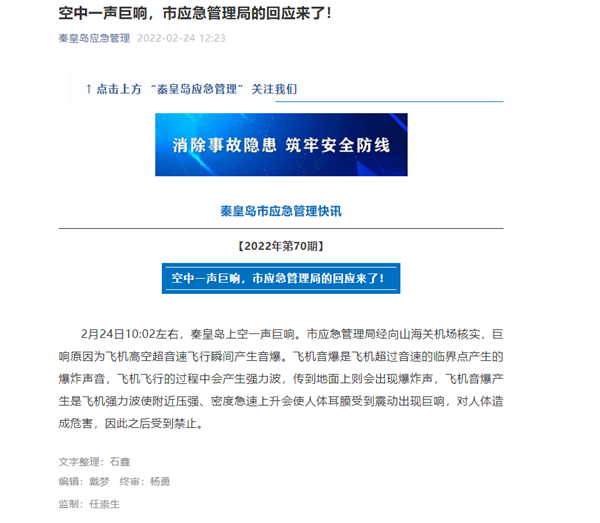 在2022年2月的时候,河北秦皇岛上空一声巨响,也引发网友关注和热议。